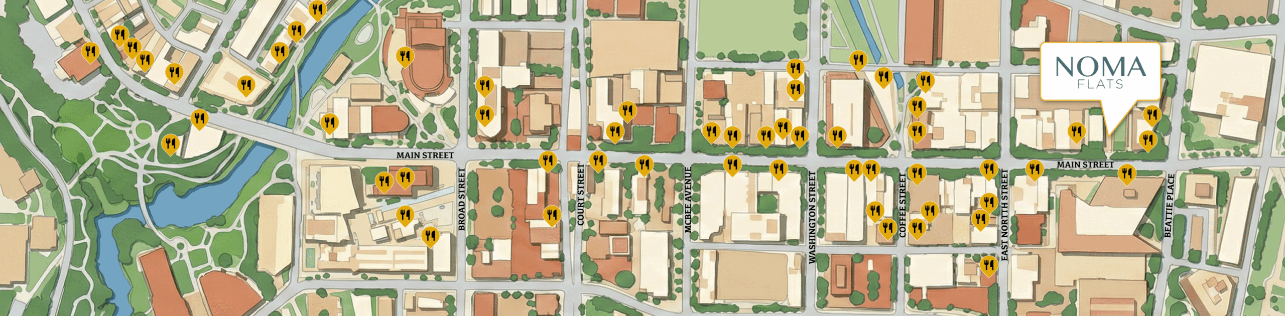 Located in the heart of downtown Greenville, NOMA Flats blends historic charm with modern convenience. Positioned directly across from NOMA Square and steps from Main Street, residents enjoy immediate access to vibrant dining, boutique shopping, and year-round cultural events.
